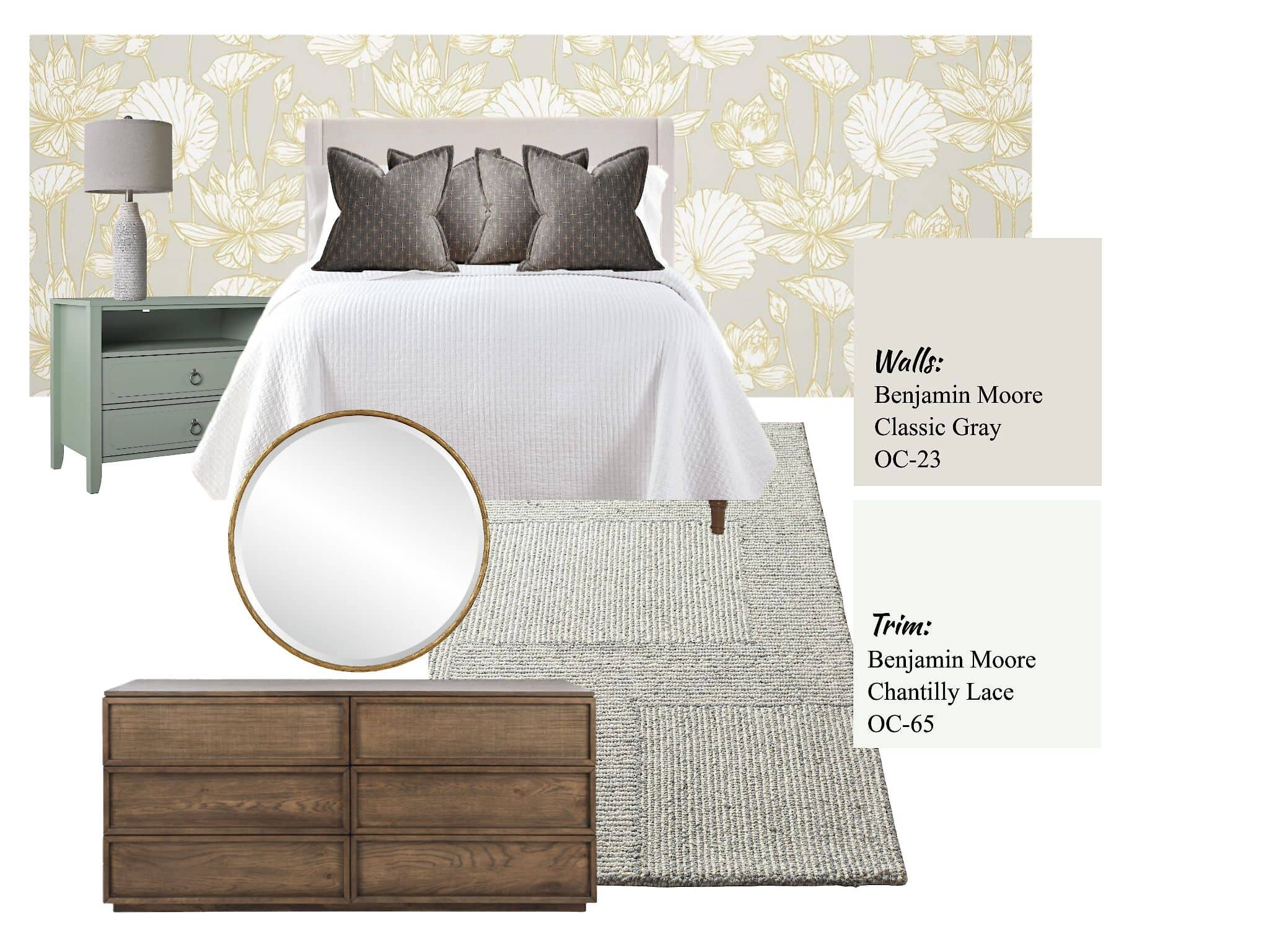 SHOP: BED | QUILT | PILLOWS | NIGHT STAND | LAMP | WALLPAPER | RUG | DRESSER | MIRROR Your bedroom is more than just