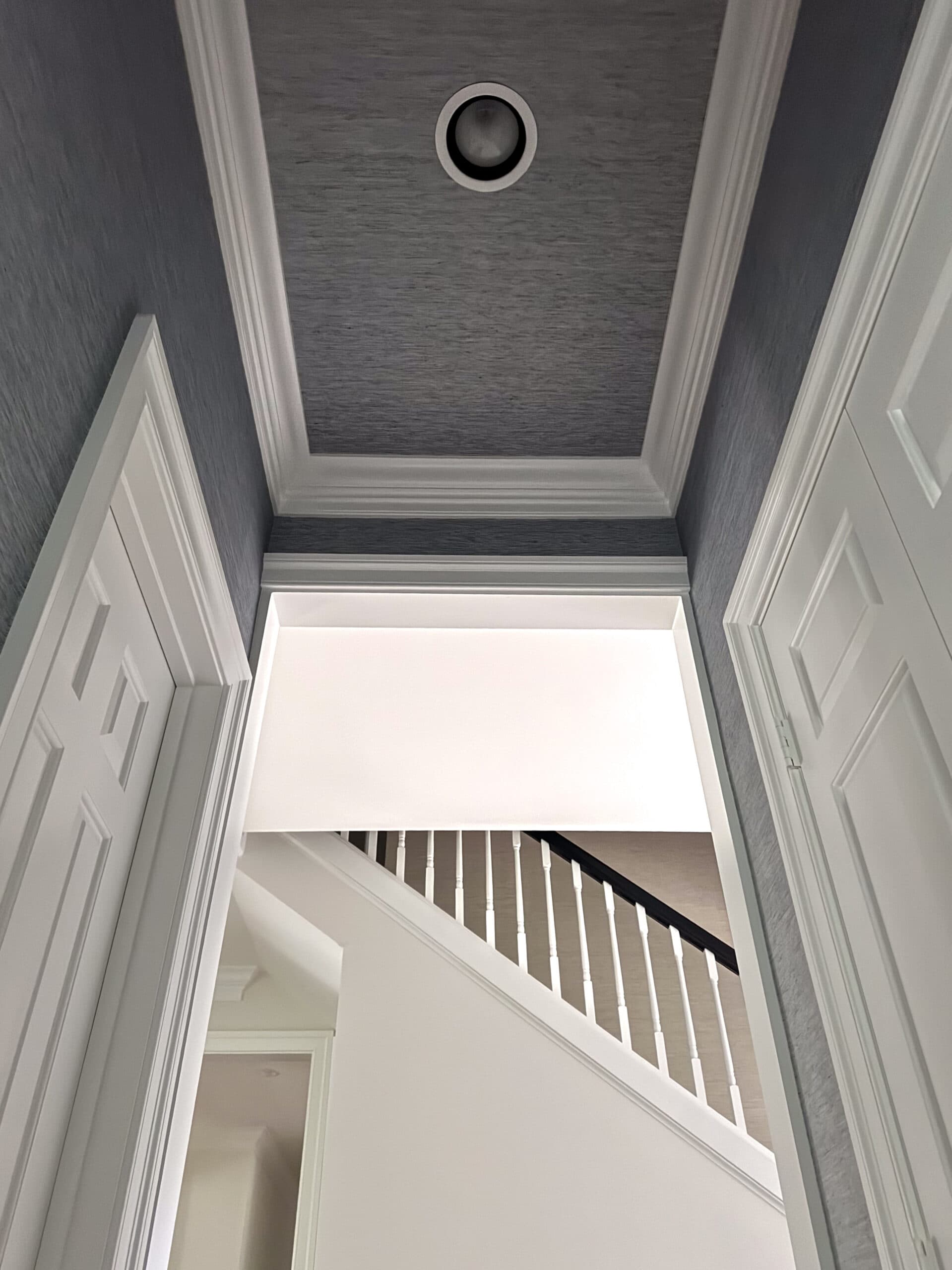 The staircase went from basic to bespoke, complete with the most amazing runner, painted banister, and custom millwork that feels like it belongs in a chic London townhouse (or a coastal home); and yes, that grasscloth wall is doing a lot of heavy lifting in the sophistication department.